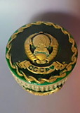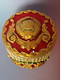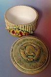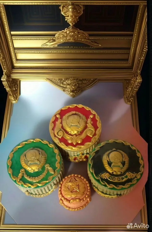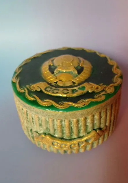 - Дизайн: Каждая из трех крупных шкатулок украшена объемным изображением Государственного Герба СССР (серп и молот, земной шар, колосья пшеницы, красная звезда). Детали герба проработаны с невероятной точностью и покрыты золотой краской, имитирующей старинную позолоту.