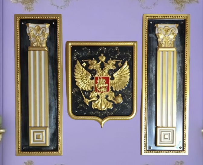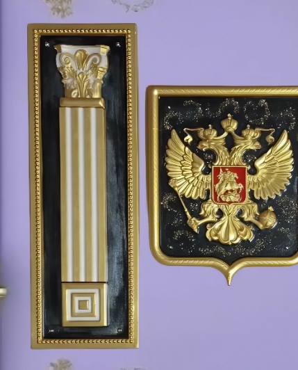 Представляем Вашему вниманию уникальный комплект декоративного панно – Государственный Герб Российской Федерации, выполненный из высококачественного гипса, фланкированный двумя элегантными пилястрами. Эта монументальная композиция станет центральным элементом любого интерьера, подчеркивая статус, патриотизм и безупречный вкус владельца.