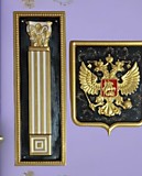 - Ручная Работа и Детализация: Каждый элемент композиции выполнен с исключительной тщательностью и вниманием к деталям. Рельефная проработка двуглавого орла, державы, скипетра и щита с изображением Святого Георгия Победоносца поражает своей выразительностью.