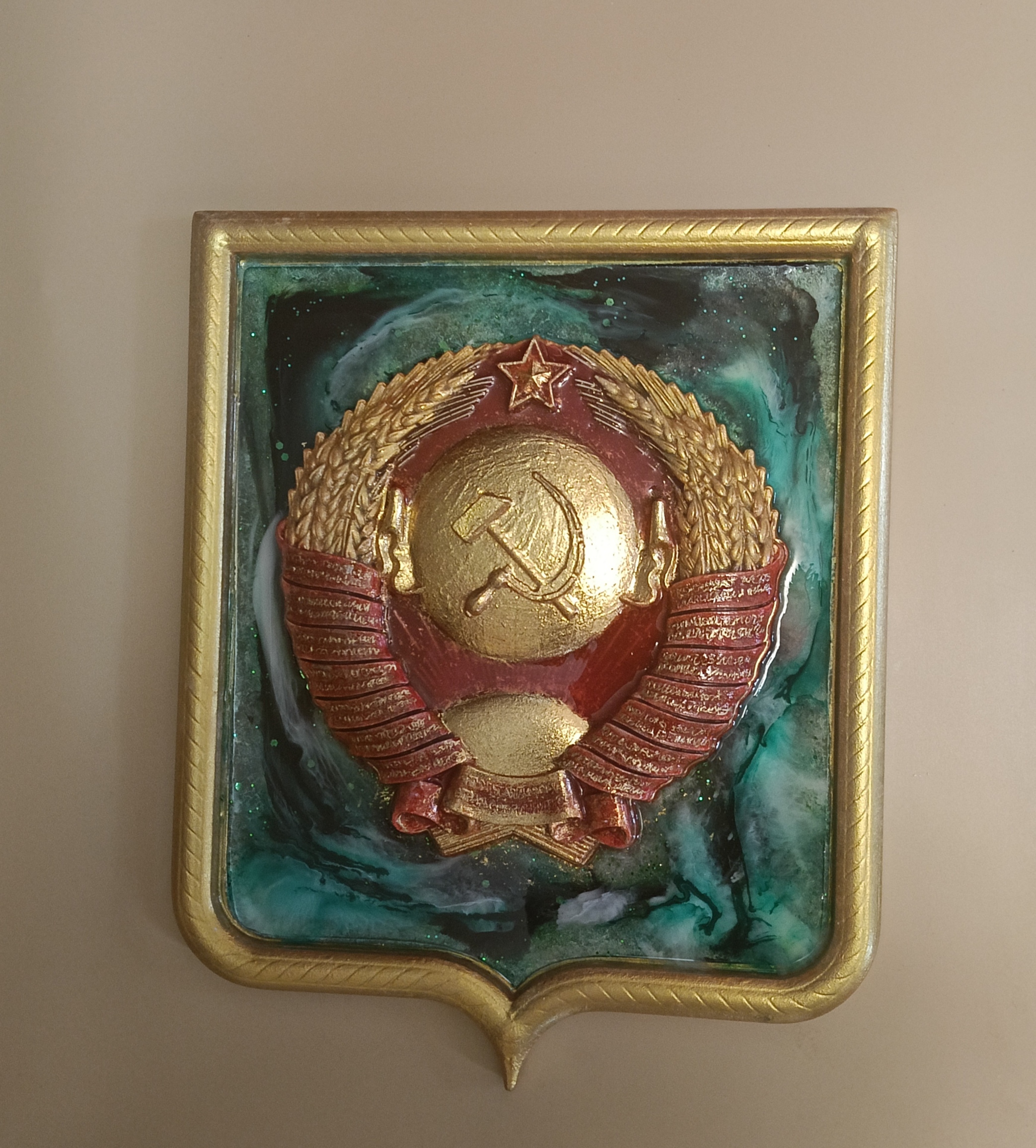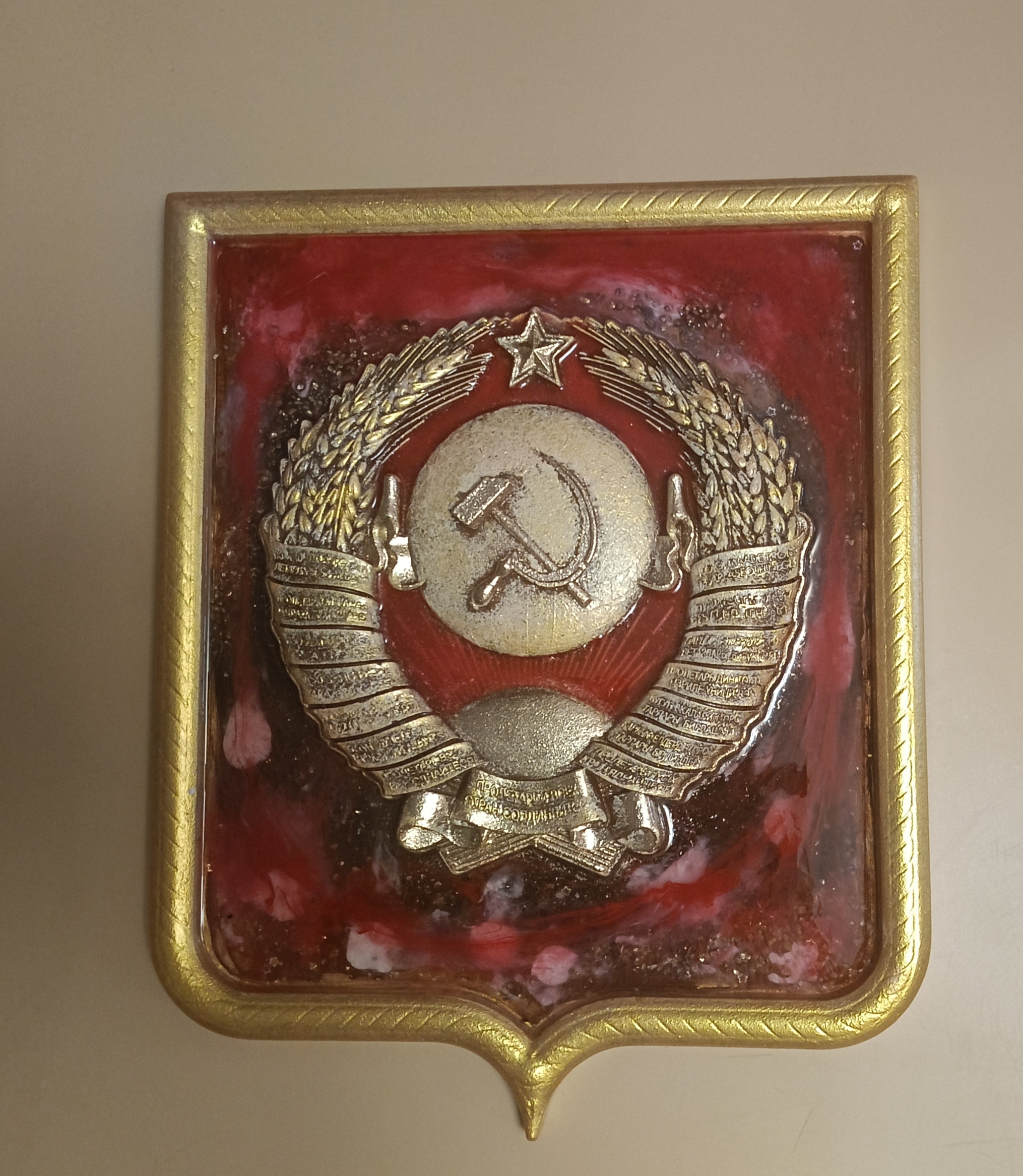 - Высококачественный Гипс и Ручная Работа: Герб изготовлен из прочного, долговечного гипса. Каждая деталь объемного рельефа — серп и молот, земной шар, колосья пшеницы и красная звезда — тщательно проработана вручную, что гарантирует высокое качество и уникальность каждого изделия.