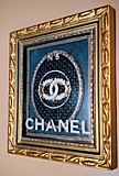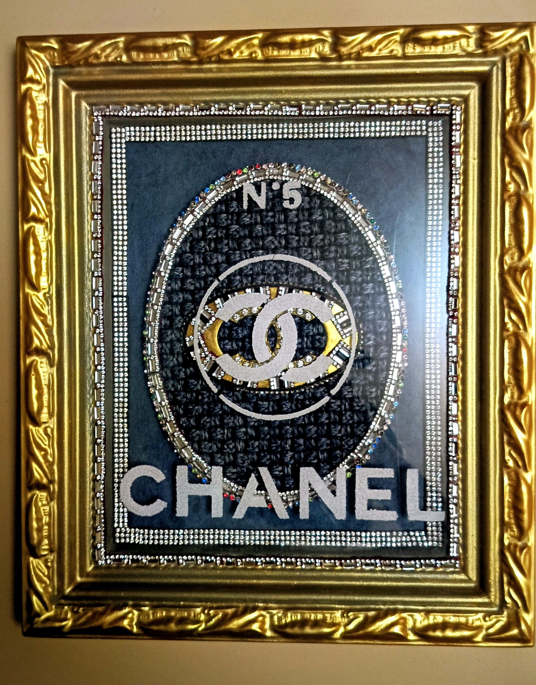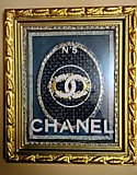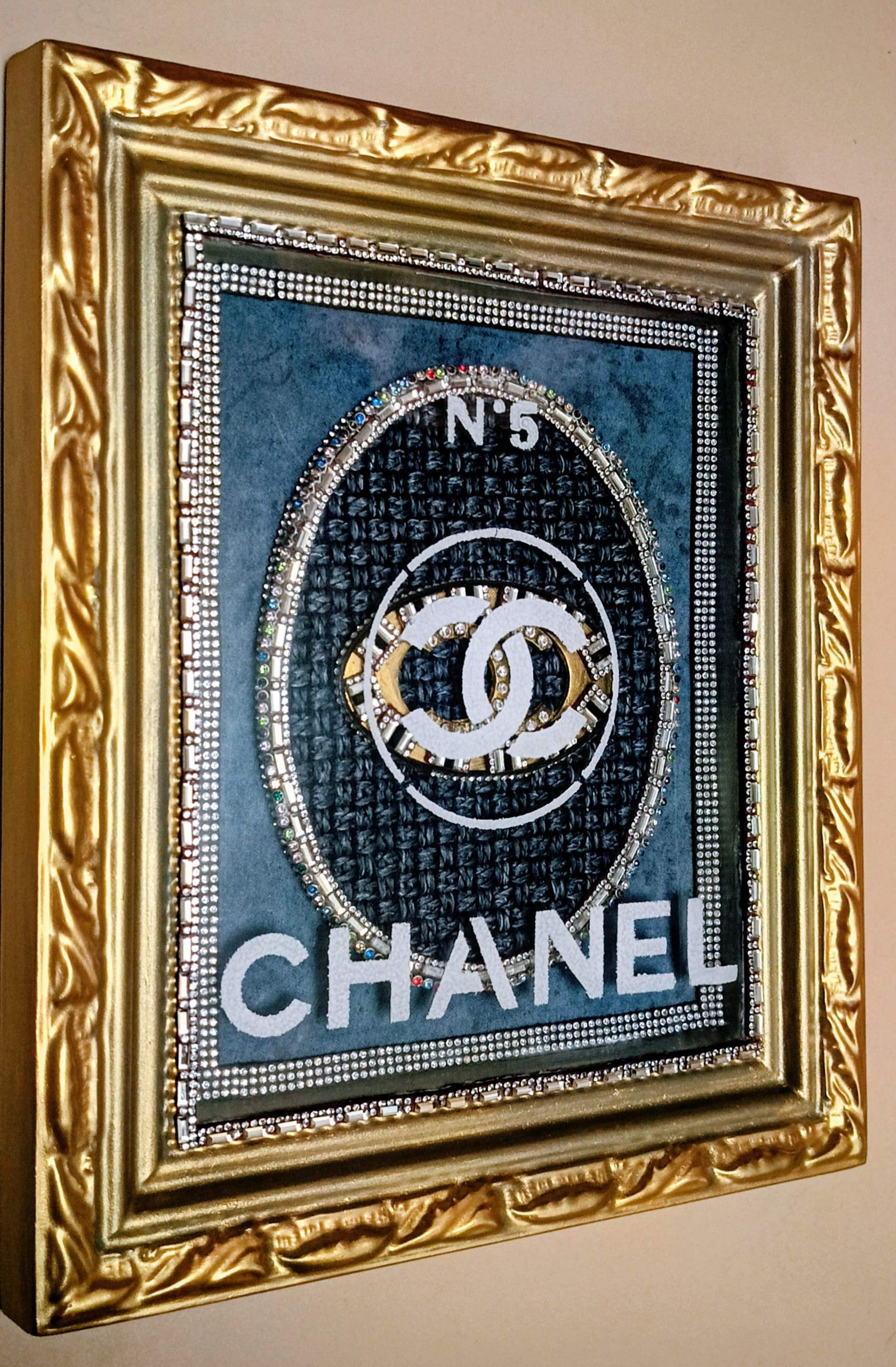 В центре композиции — знаменитый переплетенный логотип "СС", выполненный с ослепительным блеском кристаллов и металлических элементов, словно инкрустированный драгоценностями. Над ним гордо возвышается число N°5, а в нижней части панно крупными буквами выложено название CHANEL, также сияющее множеством мелких страз.