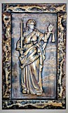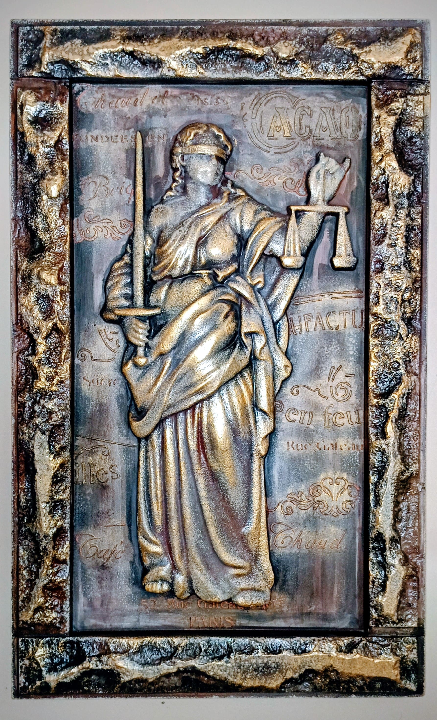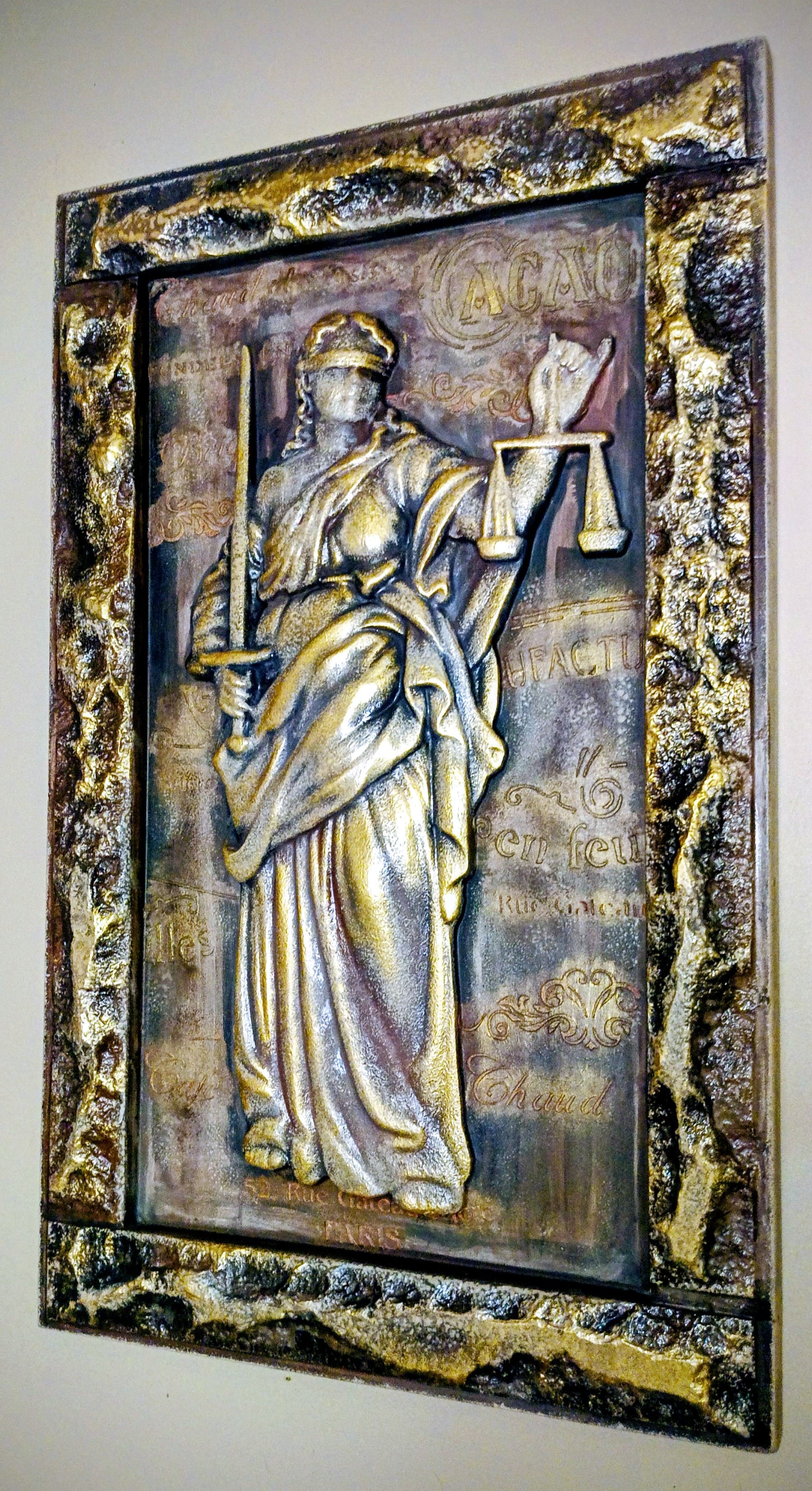 Центральная фигура Фемиды представлена со всеми ее атрибутами: глаза завязаны в знак беспристрастности, в одной руке – карающий меч, в другой – весы, символизирующие равновесие и справедливость. Искусное патинирование придает панно эффект старинной бронзы или состаренного металла, с благородными золотыми и серебряными переливами, что создает впечатление подлинной антикварной реликвии.
