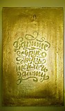 Фон панно украшен стилизованными, будто выгравированными, винтажными надписями и орнаментами (например, "CACAO", "Rue Saint-Honoré", "PARIS"), придающими композиции европейский шарм и историческую глубину. Особенно примечательна рама: она выполнена с нарочитой грубостью, имитируя старый камень или металл, с богатыми золотыми вкраплениями и темными акцентами, что подчеркивает силу и монументальность центрального образа.