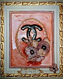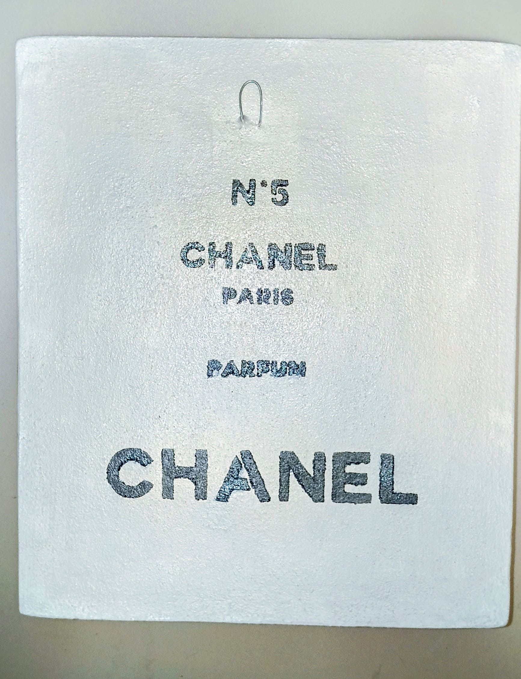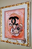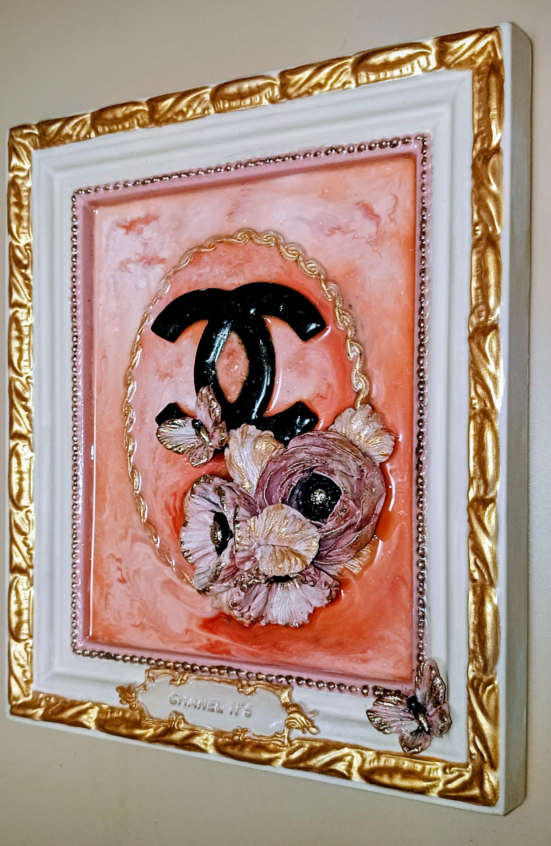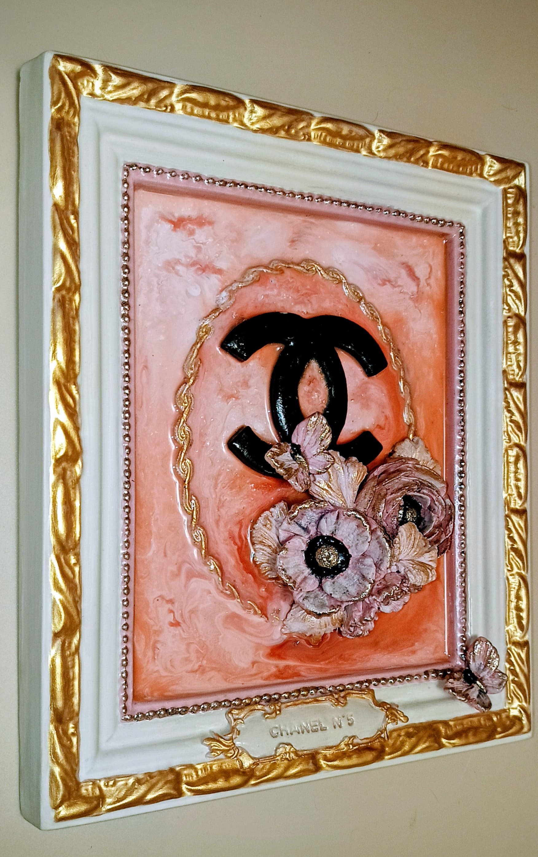 Композицию оживляют изящные объемные цветы, выполненные в пудровых, золотистых и приглушенных розовых тонах, которые деликатно дополняют общую палитру. Особую легкость и воздушность придает миниатюрная бабочка, присевшая у основания панно. В нижней части композиции расположена изящная табличка с культовой надписью "CHANEL N°5", подчеркивающая престиж и узнаваемость образа.