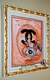 Панно обрамлено двойным багетом: внутренний контур украшен миниатюрными бусинами или золотой цепочкой, а внешний — массивной рамой цвета слоновой кости с эффектным золотым орнаментом, напоминающим переплетения и завитки высокой моды.