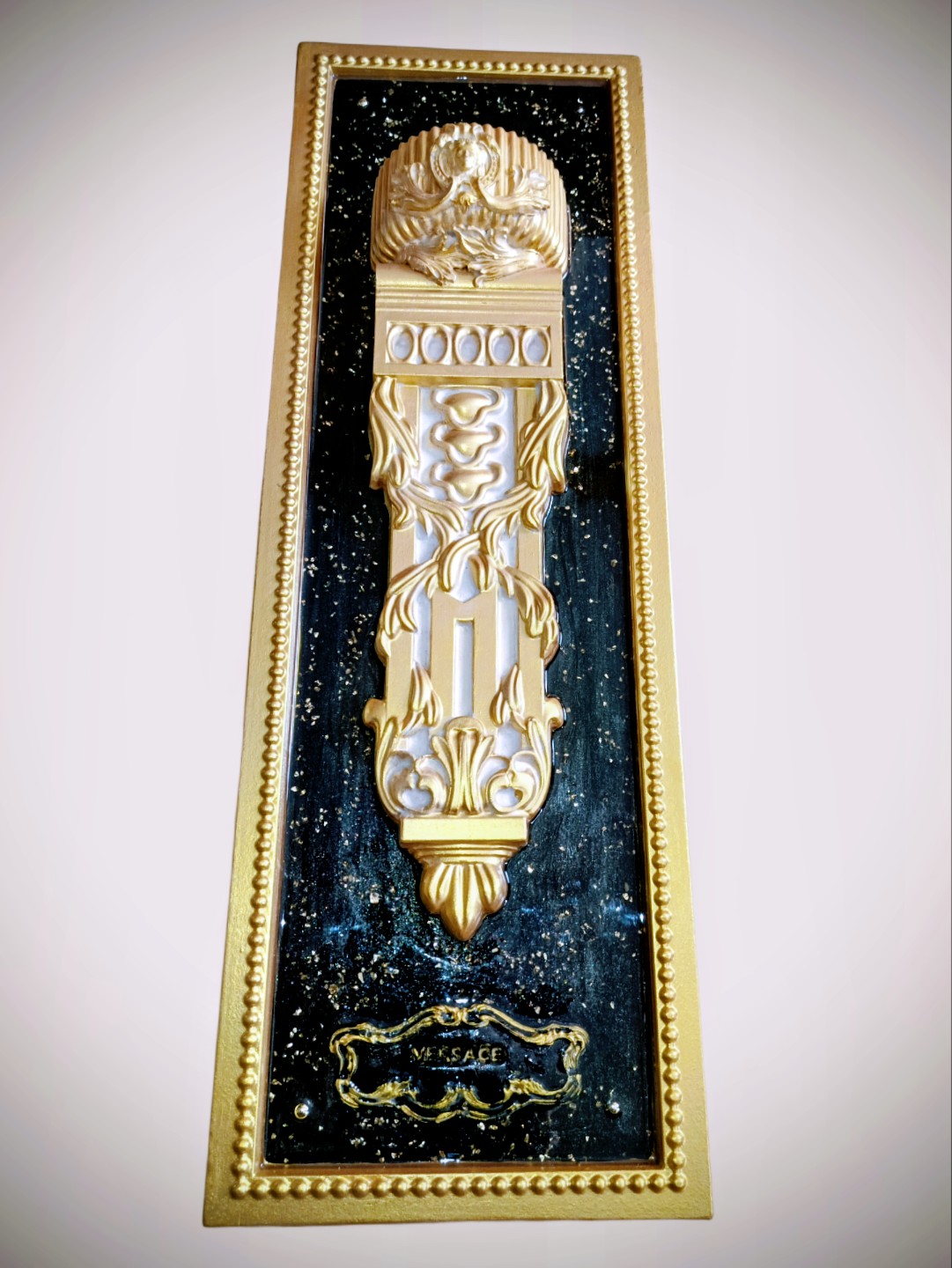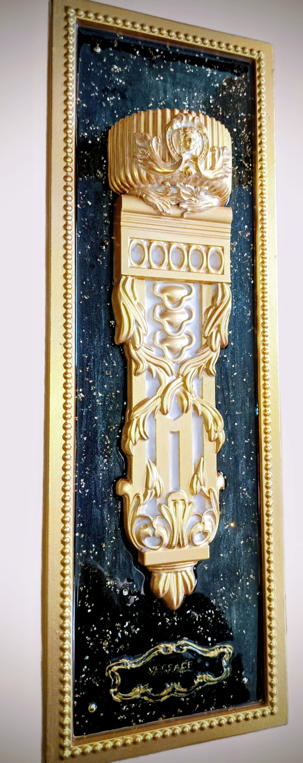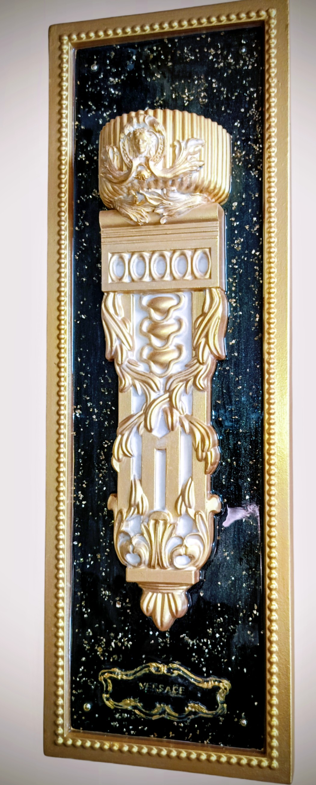 - Центральный Орнамент: В основе композиции – вертикальный рельефный элемент, напоминающий фрагмент классической колонны, изысканной консоли или настенного кашпо/кронштейна. Он украшен сложными барочными узорами, стилизованным изображением головы Медузы Горгоны (ключевого символа Versace) в верхней части и другими греческими мотивами, что мгновенно отсылает к эстетике знаменитого бренда.