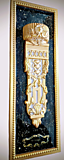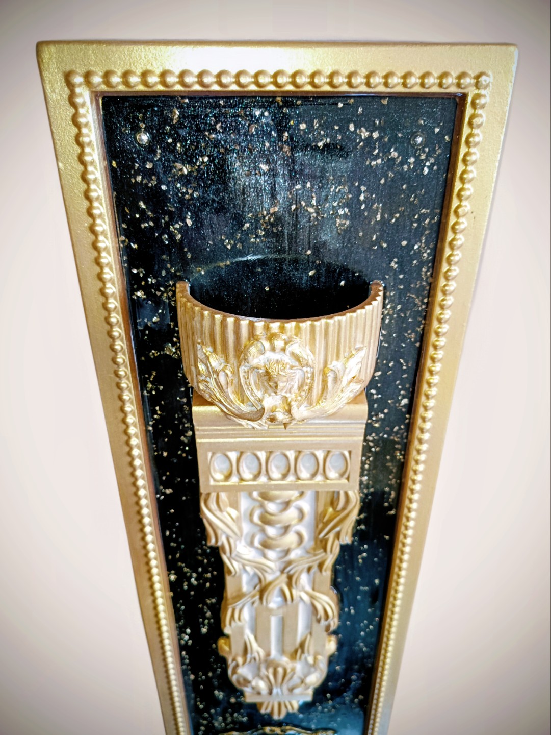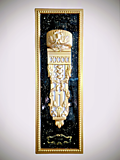 - Роскошная Цветовая Гамма: Основной рельеф выполнен в насыщенном золотом цвете с легкой патиной, что придает ему вид старинной бронзы или благородного металла. Фон панно – глубокий глянцевый черный, инкрустированный мелкими золотистыми блёстками (или частицами потали), создающими эффект звездного неба или дорогого полудрагоценного камня, мерцающего под слоем лака.