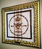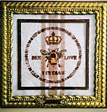 - Эффект Старины: Центральный рисунок (пчела, корона, надписи и венок) выполнен в теплых, насыщенных оттенках коричневого и золотого, создавая впечатление старинной печати, гравюры или вышивки на натуральной ткани.